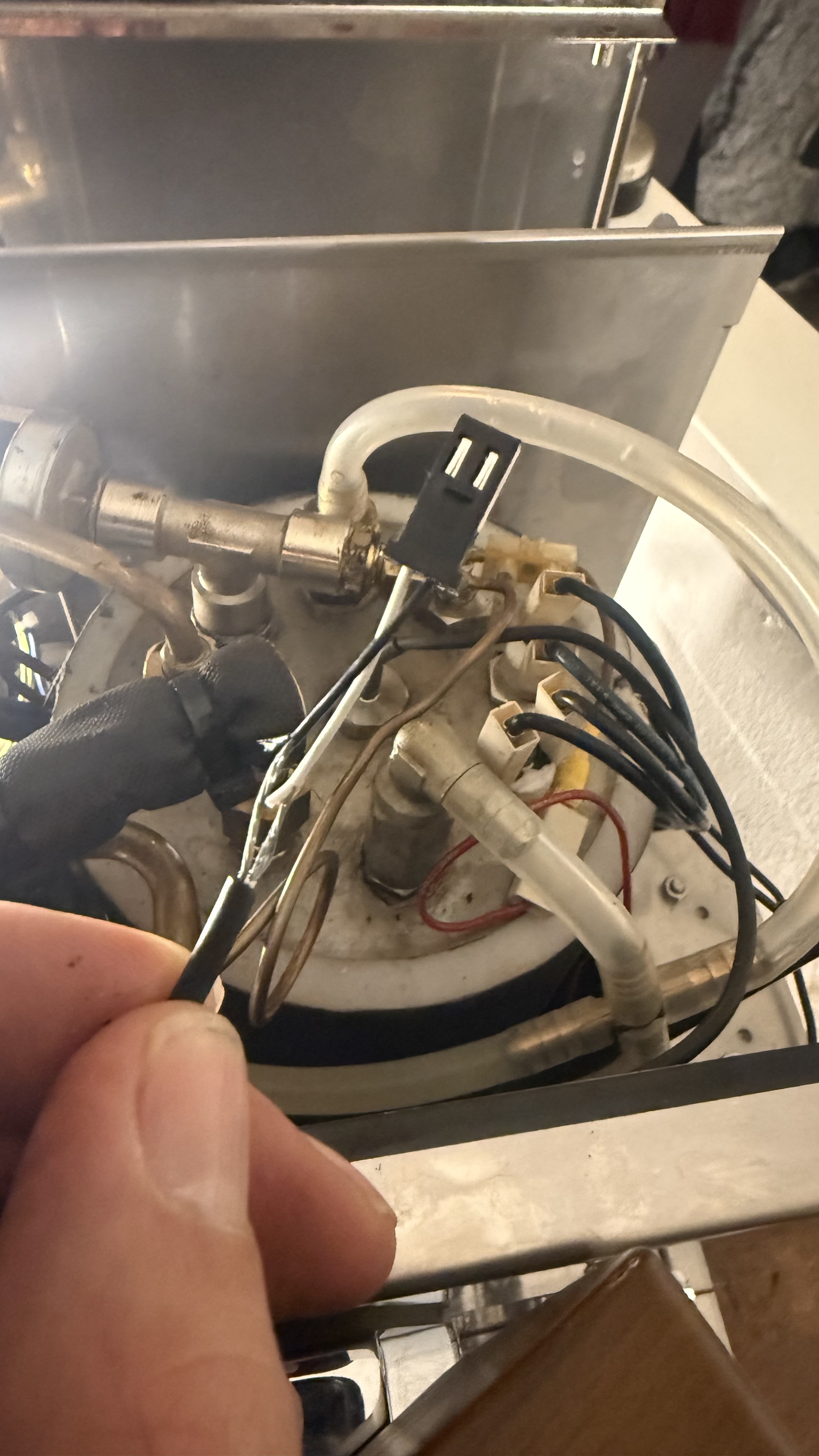 Had van de week een temperatuur storing op de PID van mijn Profitec Pro700. Bij het openen van de machine kwam ik dot tegen, een vergane kabel van de temperatuur sensor. Bij verder onderzoek was de isolatie ook onder de zwarte mantel helemaal vergaan. De kabel raakte niet directe hete onderdelen van de machine.