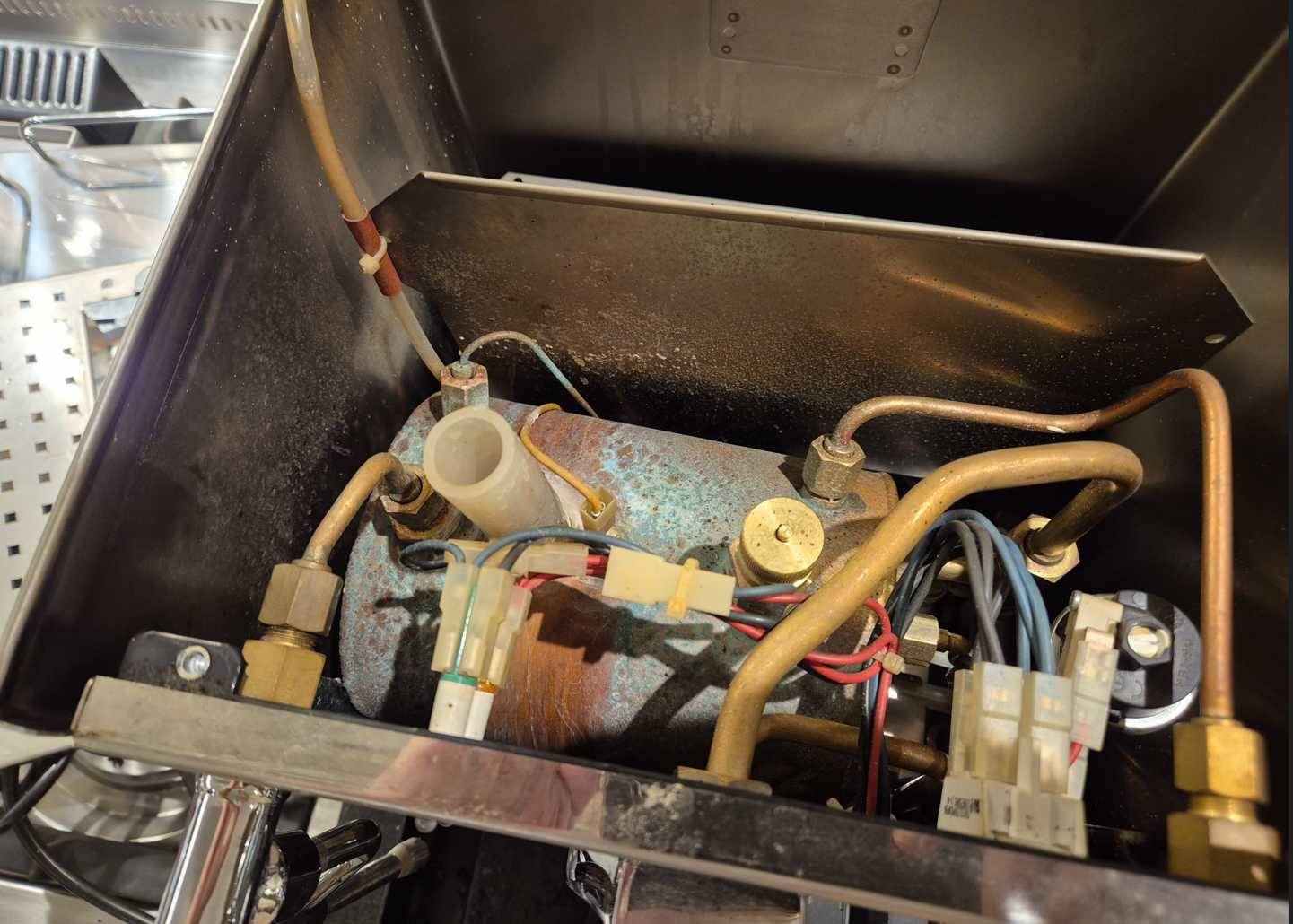 Ja, dat wordt een hele klus! Ik heb zelf net een Bezerra Magica uit 2022 gekocht via Marktplaats. Het was een koopje, want het verwarmingselement was kapot. Maar er is hier ook wel meer aan de hand, zoals een vacuumventiel dat staat te sproeien en heel veel kalk. Zie de retourslang van de pomp links boven. Die zit ook al vol met rommel. En de afvoerleiding van de ketel zit ook helemaal vol met kalk. Idd, overal kalk, en dat na toch relatief korte tijd gebruik. Inmiddels heb ik de ketel gedemonteerd en kan het grote ontkalken gaan beginnen. En ik vind het persoonlijk wel een leuk project, want hij wordt weer als nieuw.