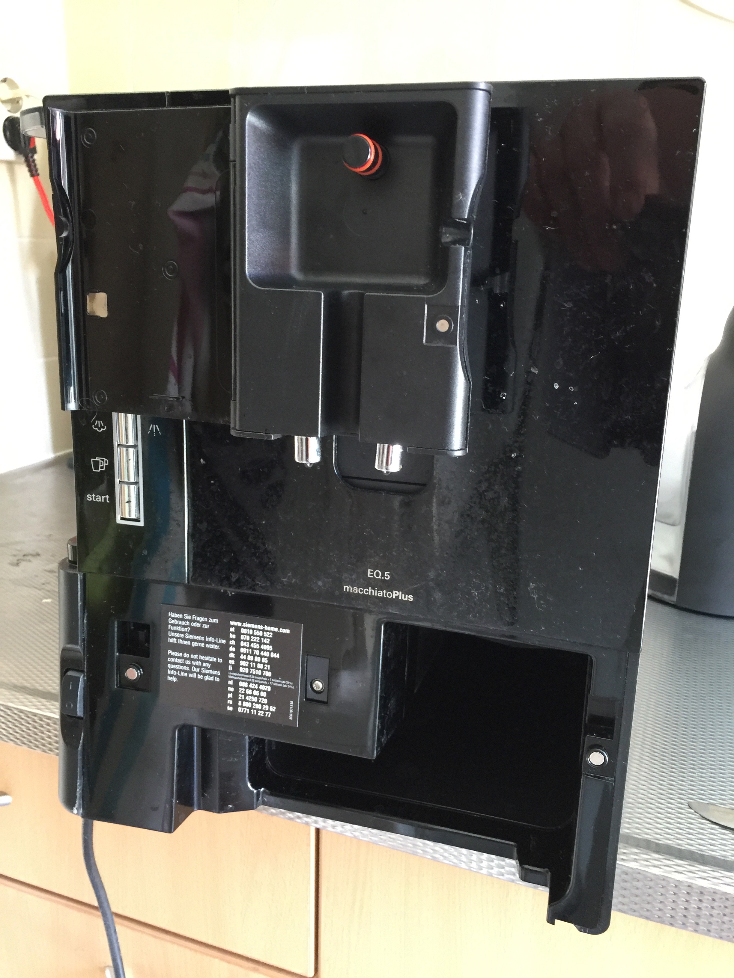 zoals de kop al vermelde hebben wij een Siemens EQ.5 Macchiato Plus waarvan naar alle waarschijnlijkheid de verdeler verstopt zit. Deze Siemens heeft een scharnierent klepje aan de voorzijde waar de verdeler achter moet zitten. Echter lukt het mij niet om er achter te komen hoe ik deze voorzijde los kan maken om de verdeler te vervangen. Mijn hoop - na 2 dagen pielen - is op deze site gericht.