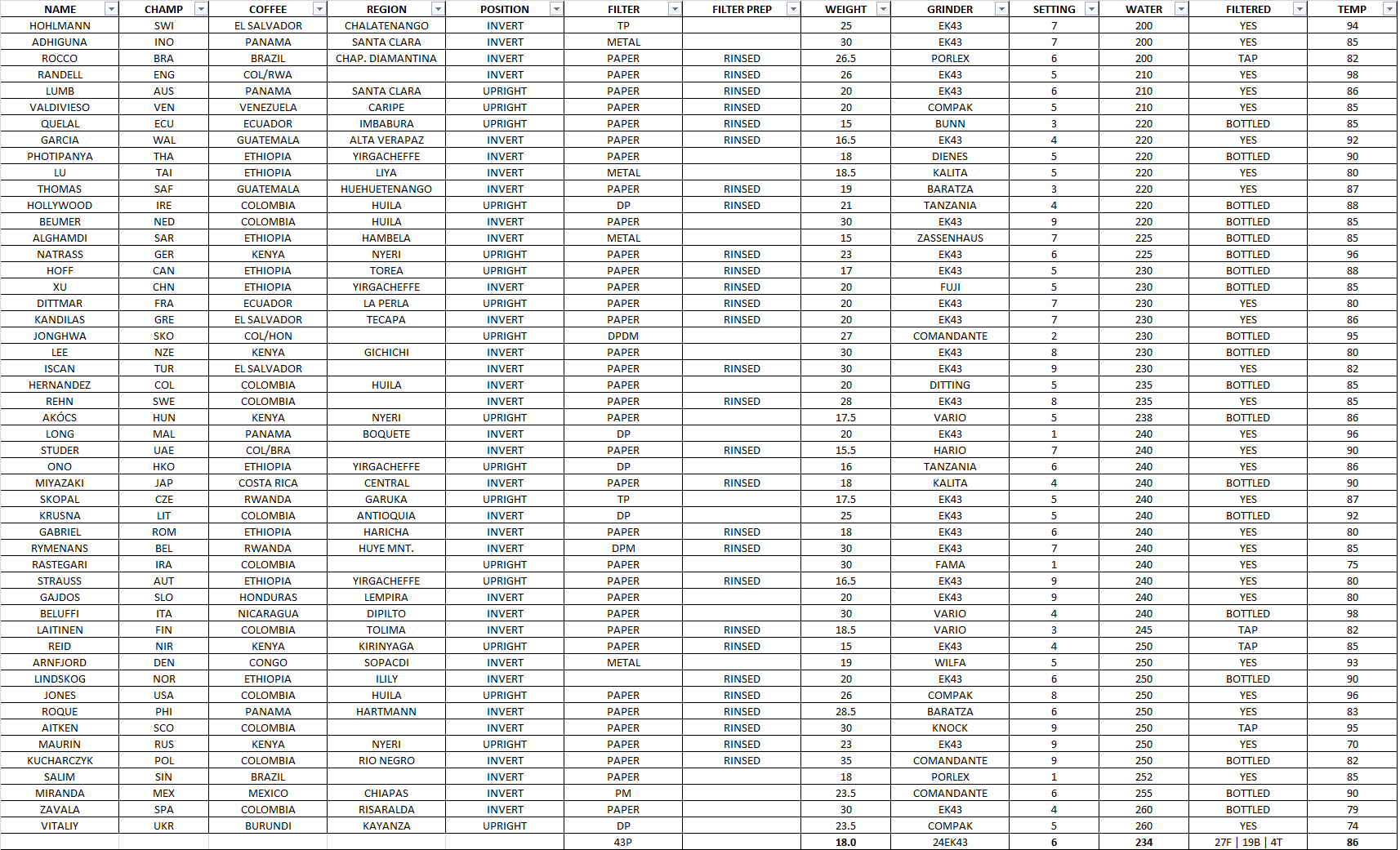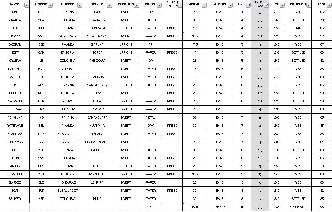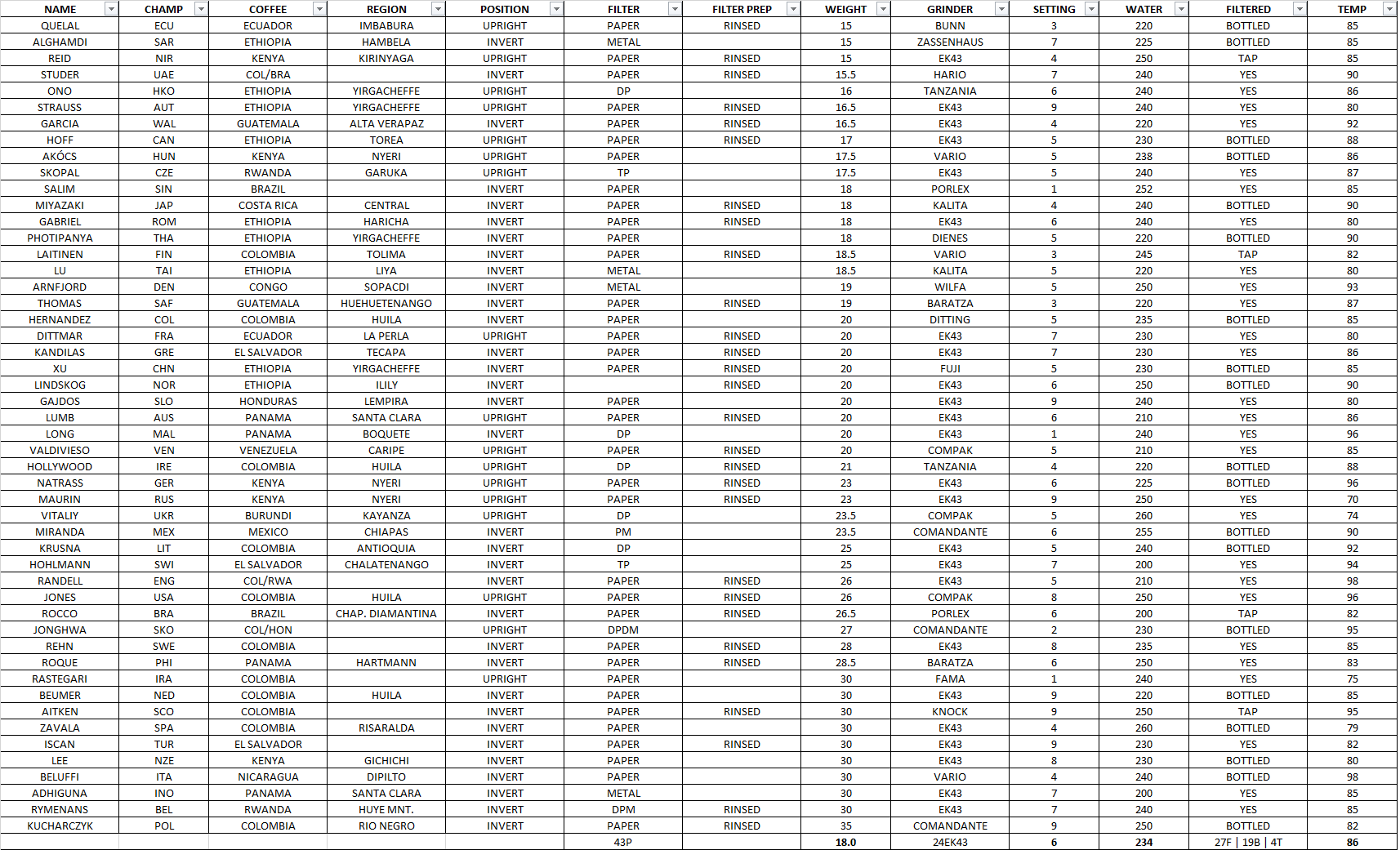 gebruikt koffieland (origin) aantal gram koffie (weight) temperatuur aantal gram water (amount of water) ek43 setting (DP = Double Paper, TP = Triple Paper, (D)PM = (Double) Paper + Metal)