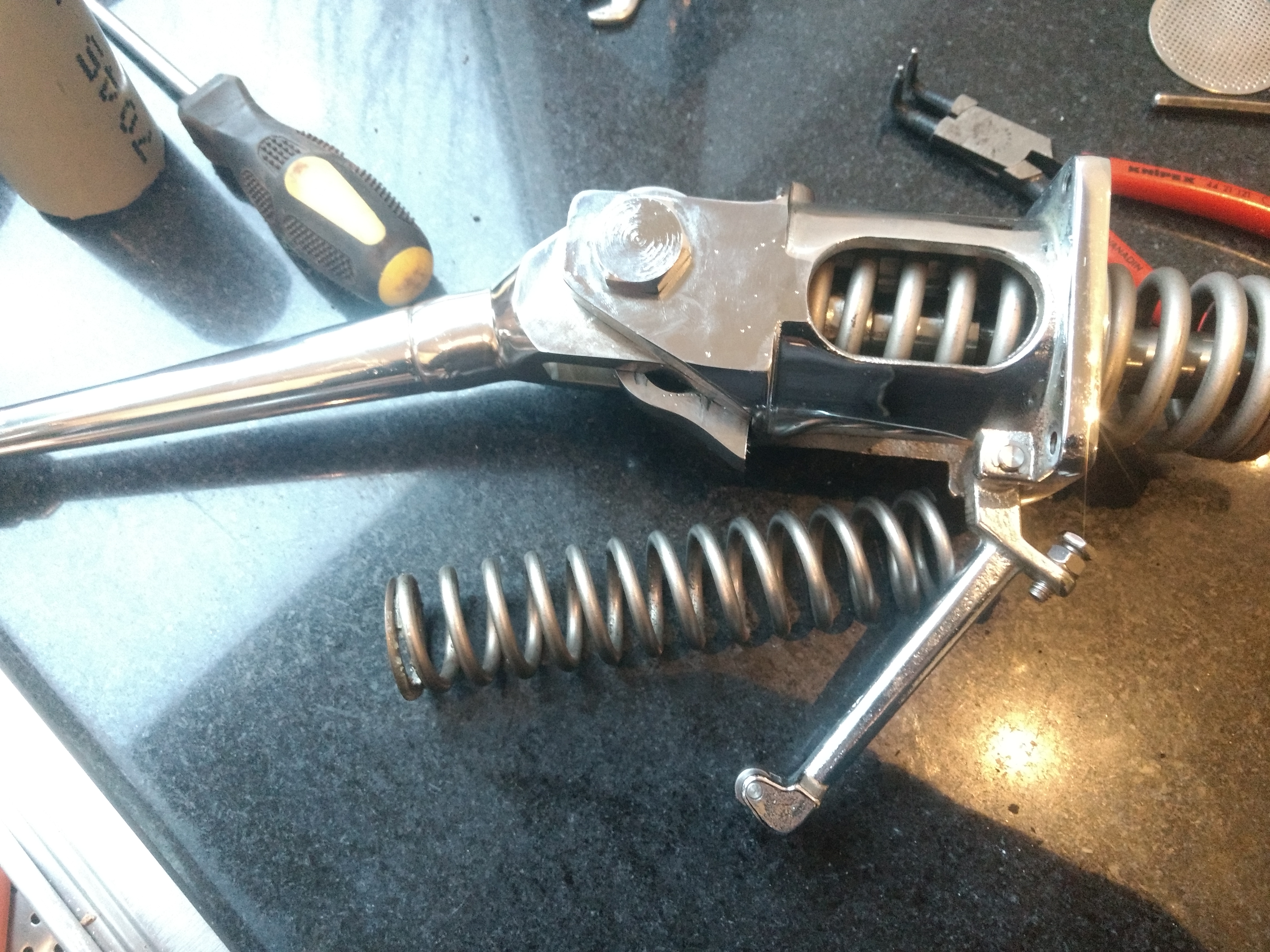 Je draait de onderste moer op de venste veer los.Daarmee draai je het verenpakket op spanning.Bij de laatste 5 windingen is alle spanning er al af en liggen de veren los.Doordacht die LSM groep. ;)