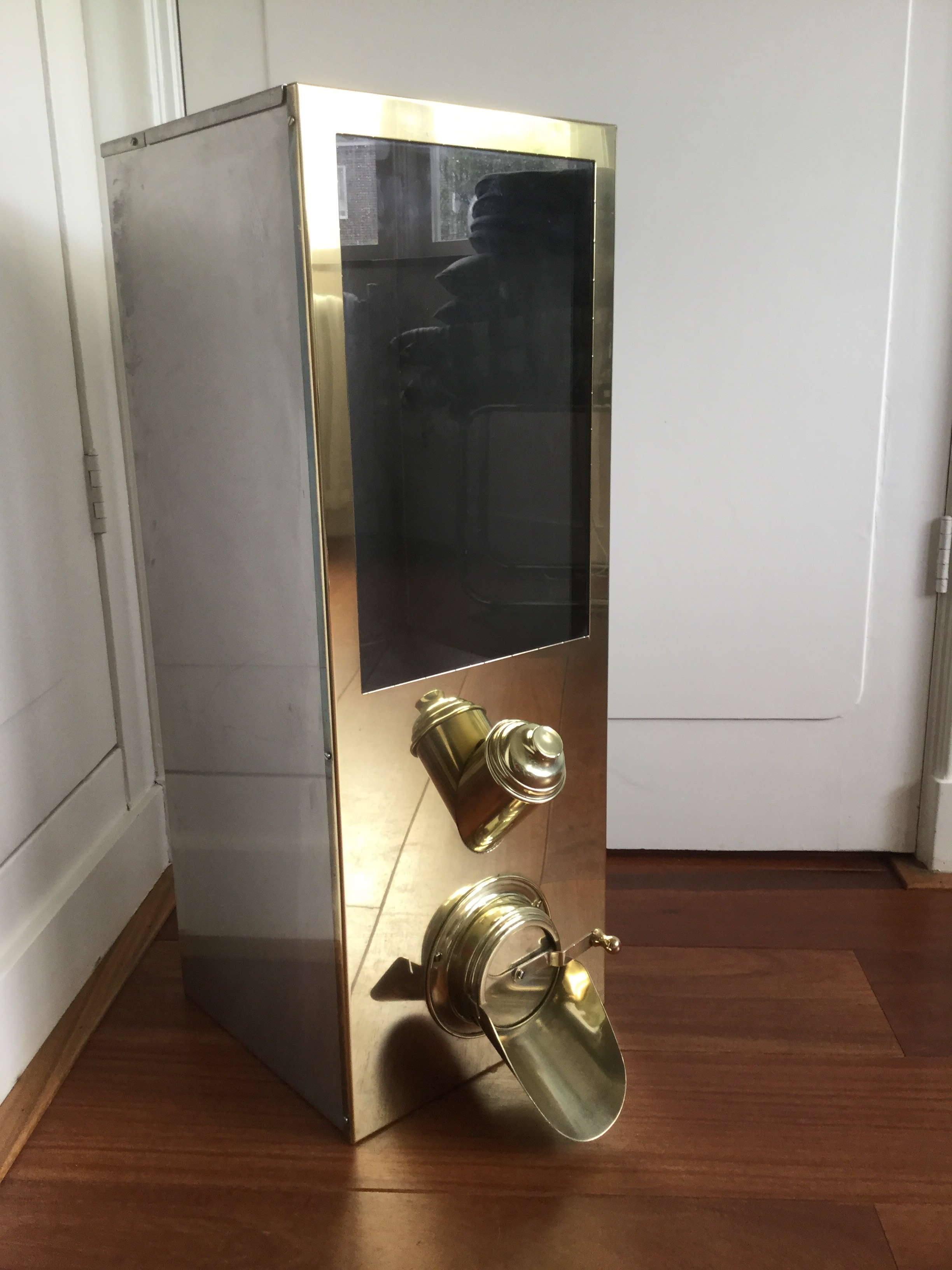 RVS met front van messing/koper. Nu opgepoetst, maar als je dat een tijdje niet doet wordt ie vanzelf weer dof met patina-look (zie een van de foto's).