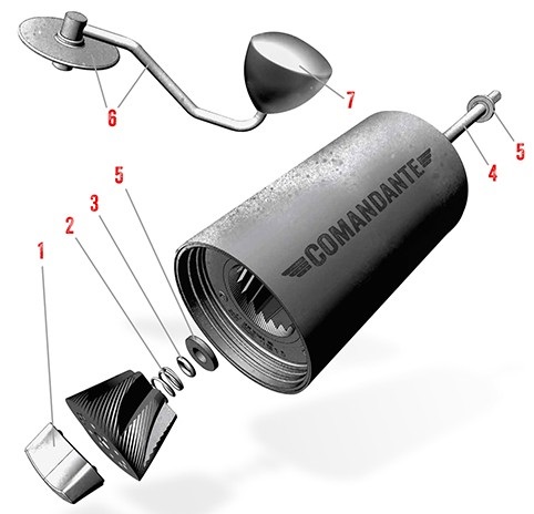 2. Verticale speling; door de bouw van de Skerton (veel plastic, veel schroefdraad) zal je vroeg of laat in meer of mindere mate te maken krijgen met verticale speling, vooral in de grovere quadranten. Mijn inspiratie voor dit project komt van de Comandante Mk3, die gebruik maakt van een veer om van de maler een wat "strakker" geheel te maken.