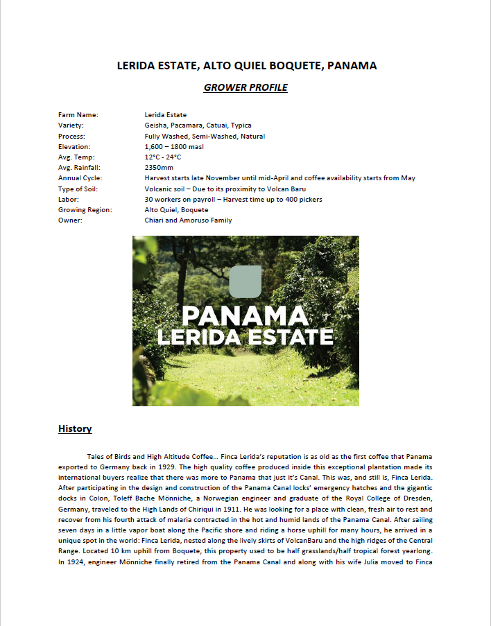 Het is dus een fully washed Panama Boquete SHG (EP) van de rassen Pacamara, Catuai en Tipica afkomstig van een single estate genaamd: Lerida Estate