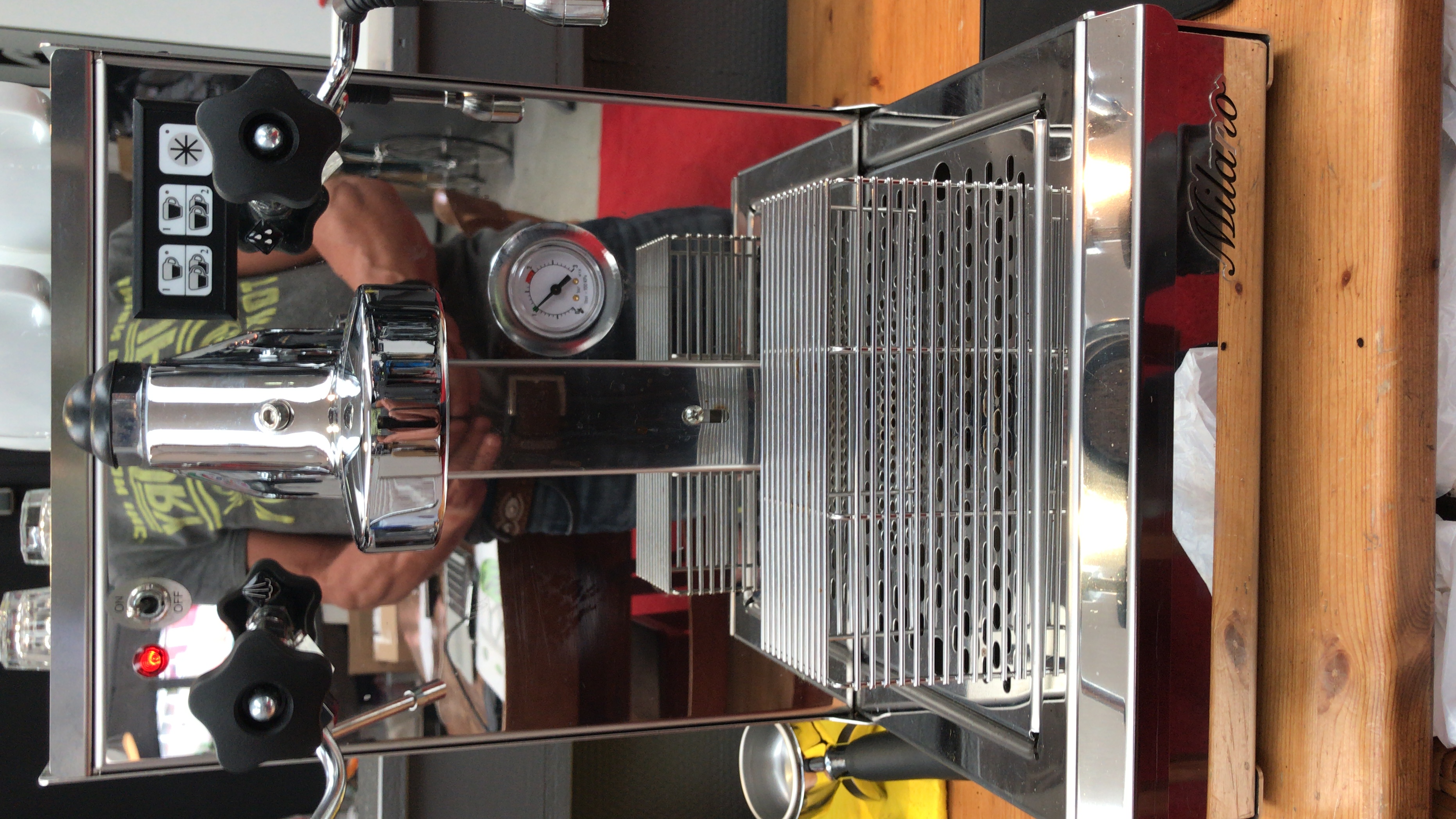 Wij hebben een gebruikte machine gekocht. Het zou gaan om een Bricoletta Fiorenzata. Met veel gedoe krijgen we er langzaam maar zeker drinkbare koffie uit. Espresso maken met de juiste maling en juiste tijd is best lastig.