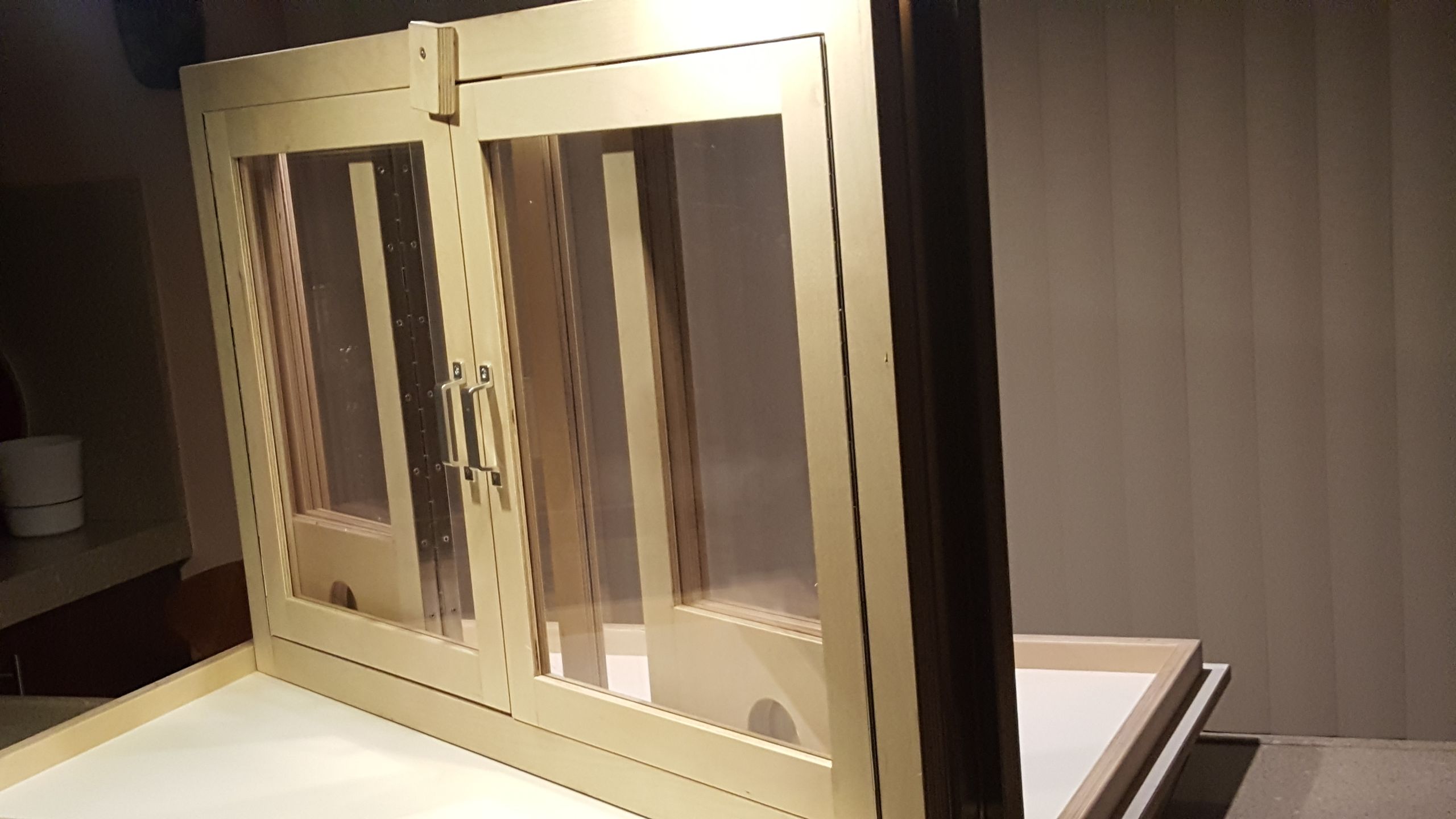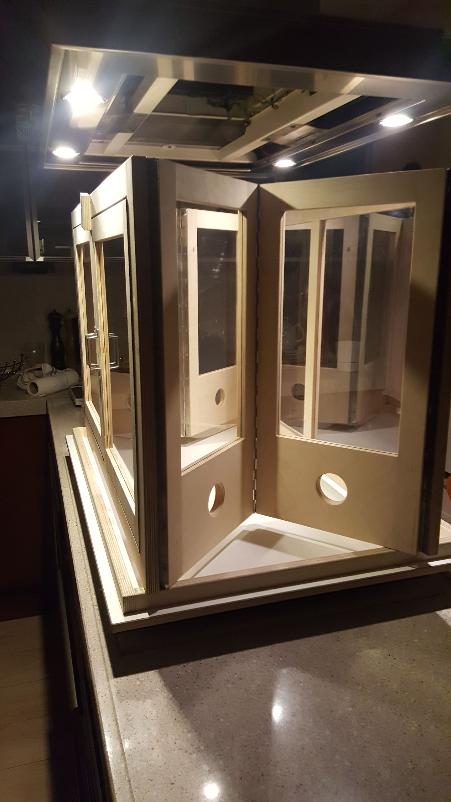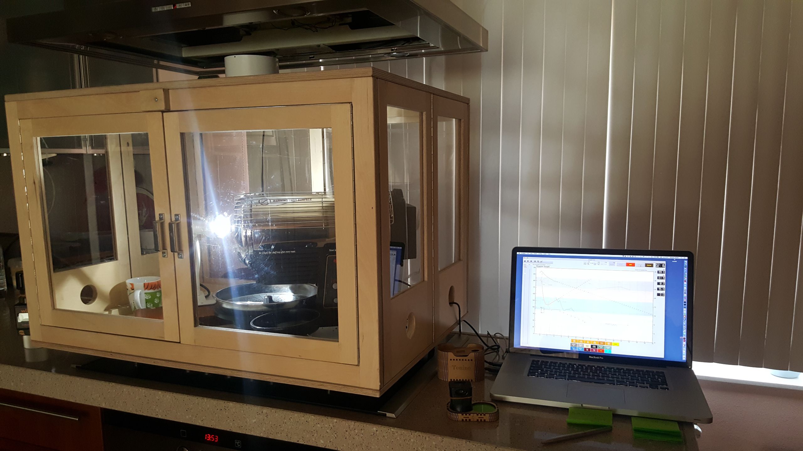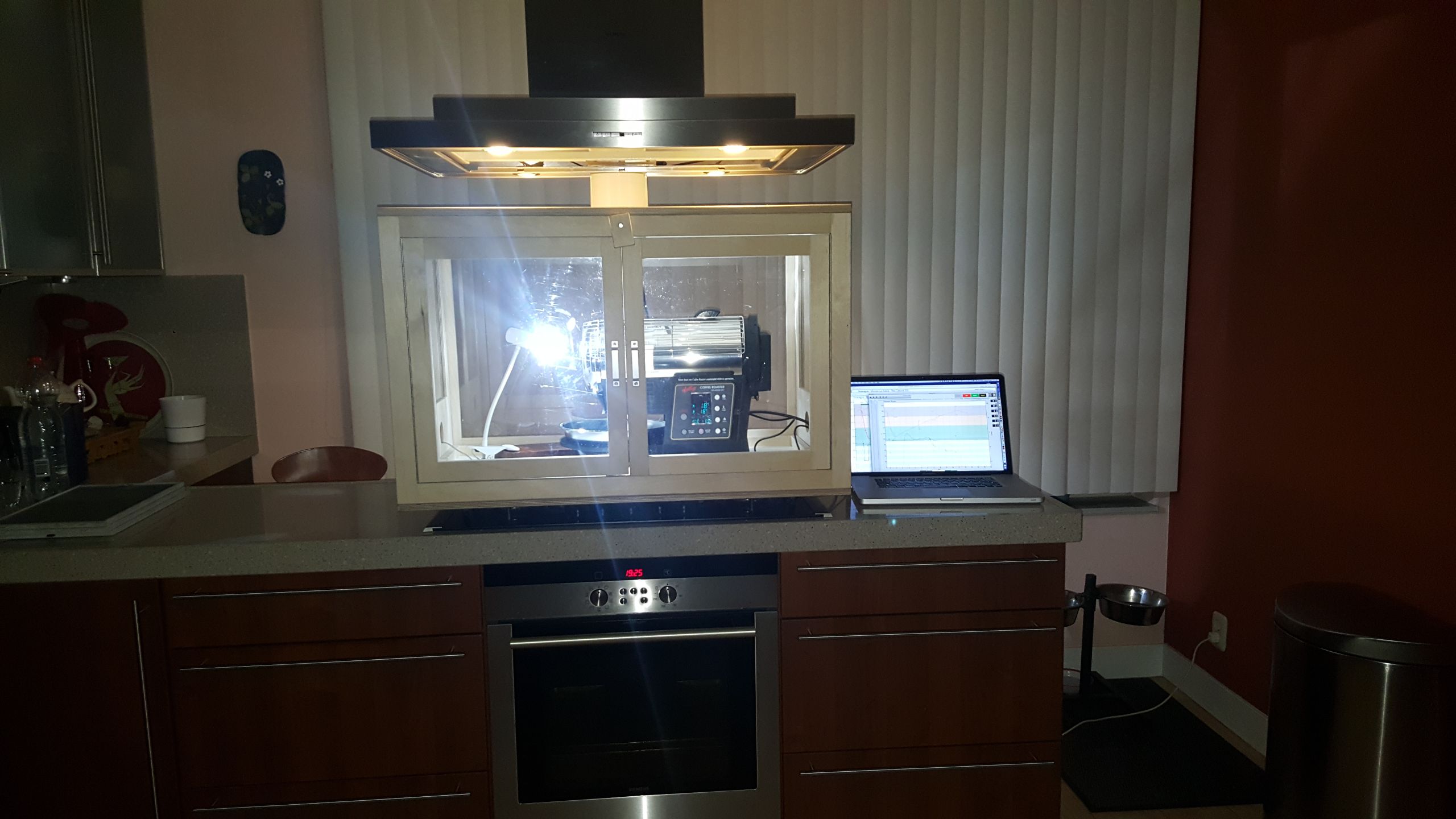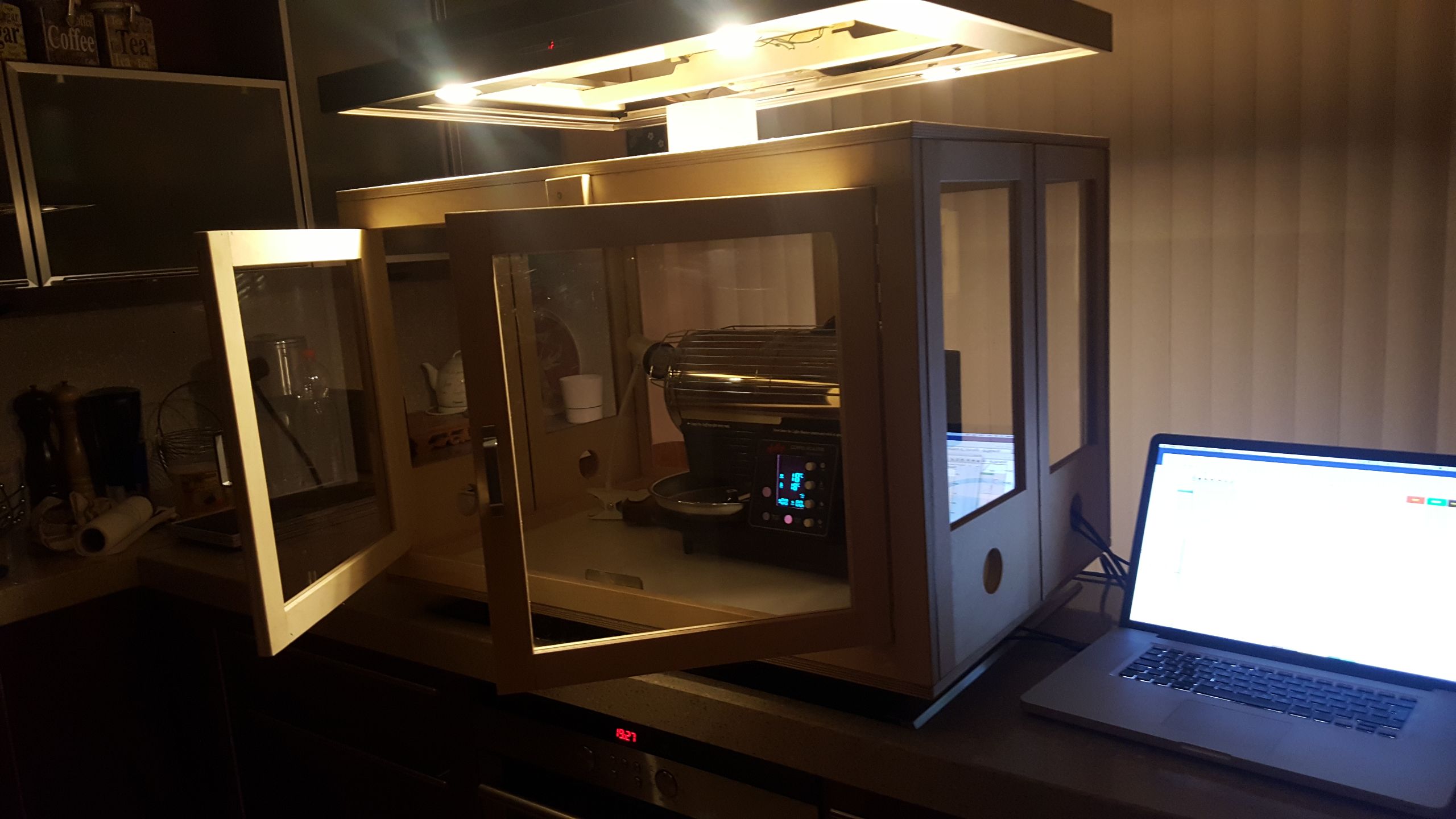 Ik brand thuis, in mijn keuken. Als met elke roaster behalve mooie bonen krijg je ook wat rook erbij. Om dat te beperken heb ik een zeer 'geavanceerde' kast ontwikkeld en laten maken. Kast is inklapbaar, neemt bijna geen ruimte en in 30 sec klaar voor gebruik.