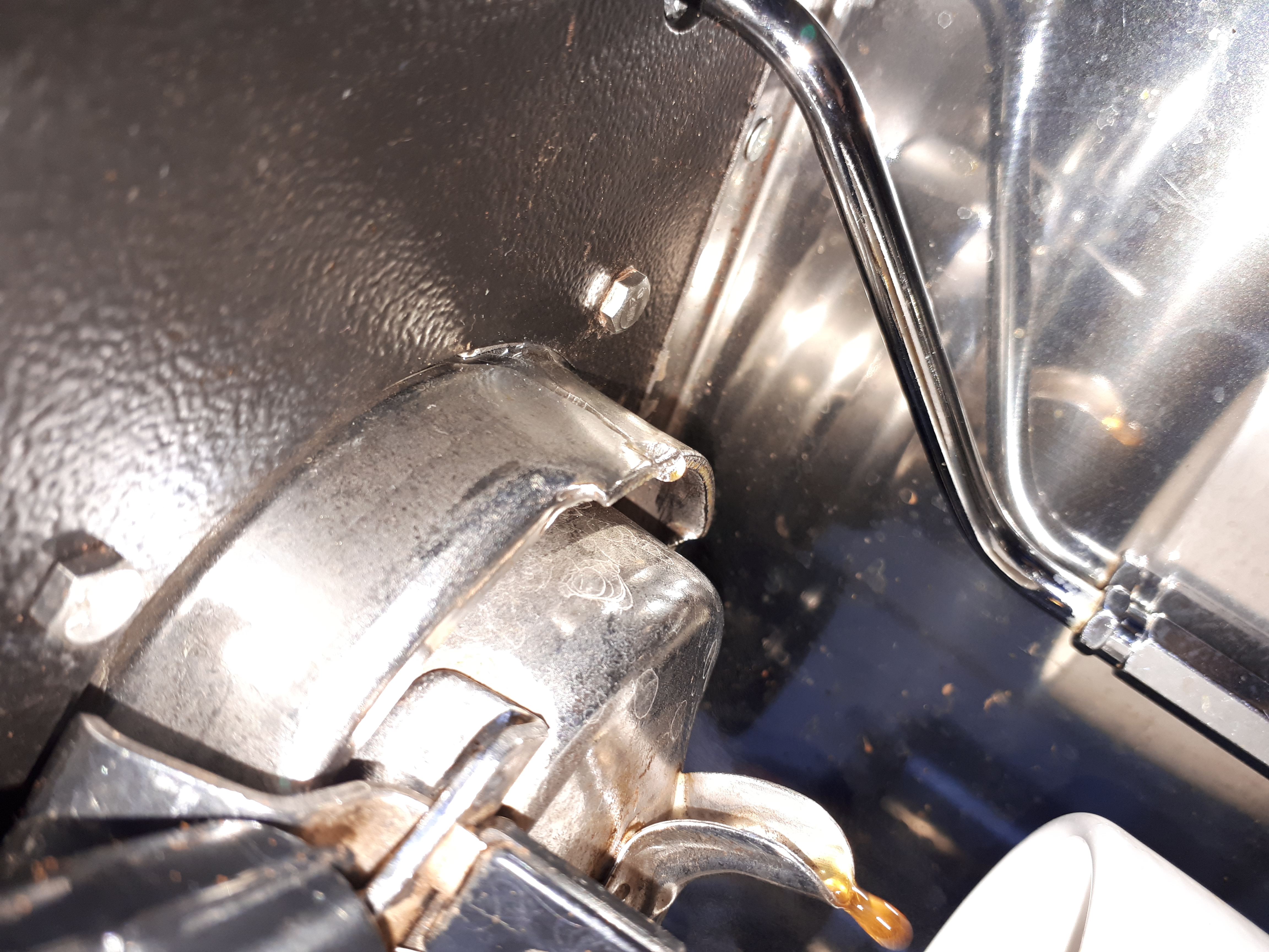 Na wat nader onderzoek (zetten van koffie met de behuizing er af) blijkt dat de magneetklep? lekt. Dit was dus blijkbaar zo veel dat het helemaal doorloopt totdat het langs de zetgroep naar buiten stroomt. Op de foto is duidelijk te zien dat het nat is en er iets van kalk/afzetting ligt. Specifieke plaats van lekken is bij het zwarte 'ringetje'.