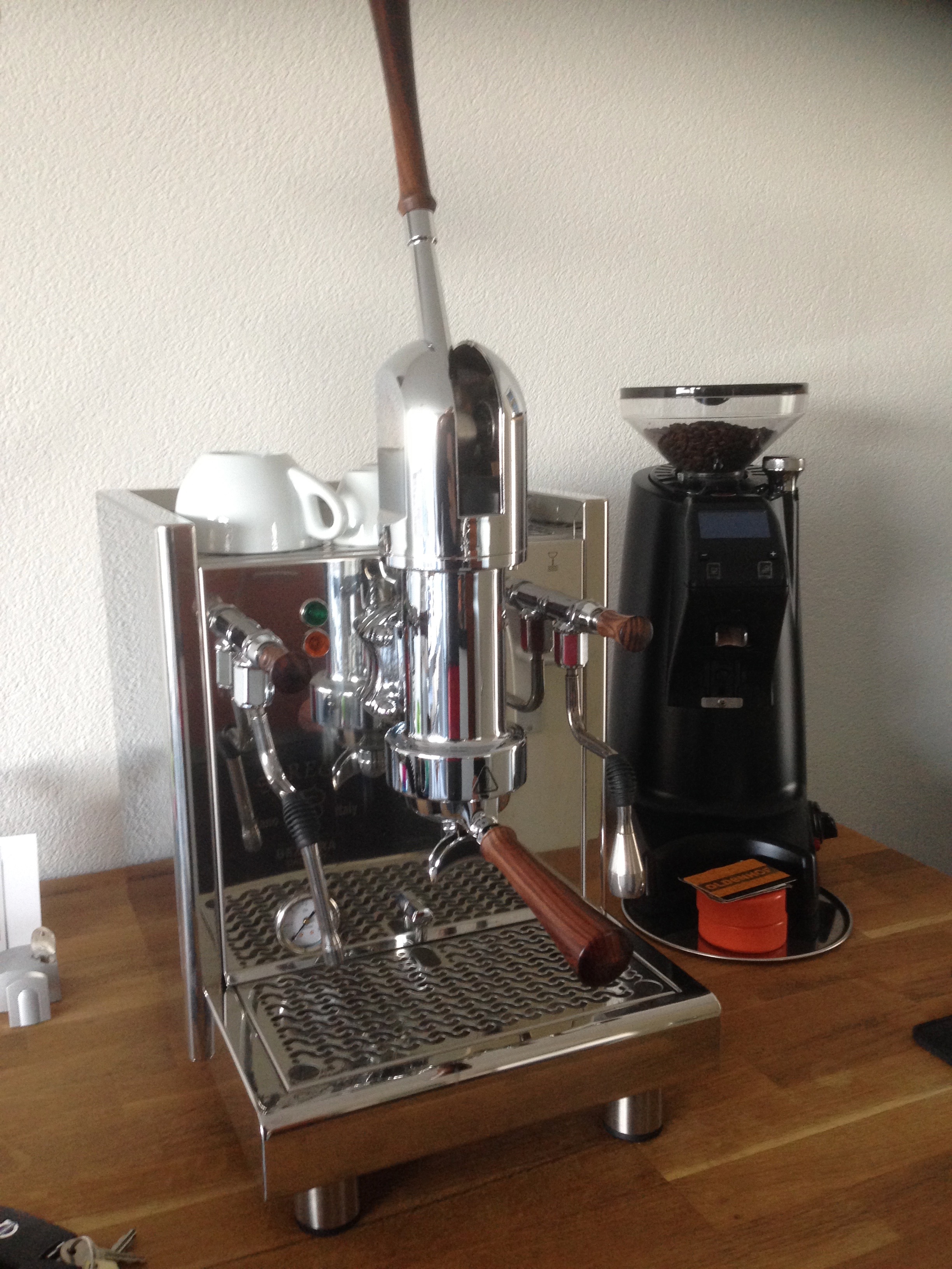 Deze Bezerra Strega heb ik oktober 2015 aangeschaft. Dit is de versie met watertank - altijd keurig onderhouden en met anti-kalk oplossingen van water voorzien. Alle originele hendels en knoppen zijn vervangen door palissander varianten, gemaakt door DiRossi. Originele Bezerra onderdelen zitten er vanzelfsprekend ook bij. Machine is met veel liefde gebruikt en onderhouden afgelopen jaren - ik durf dan ook te stellen dat de machine in top conditie is.
