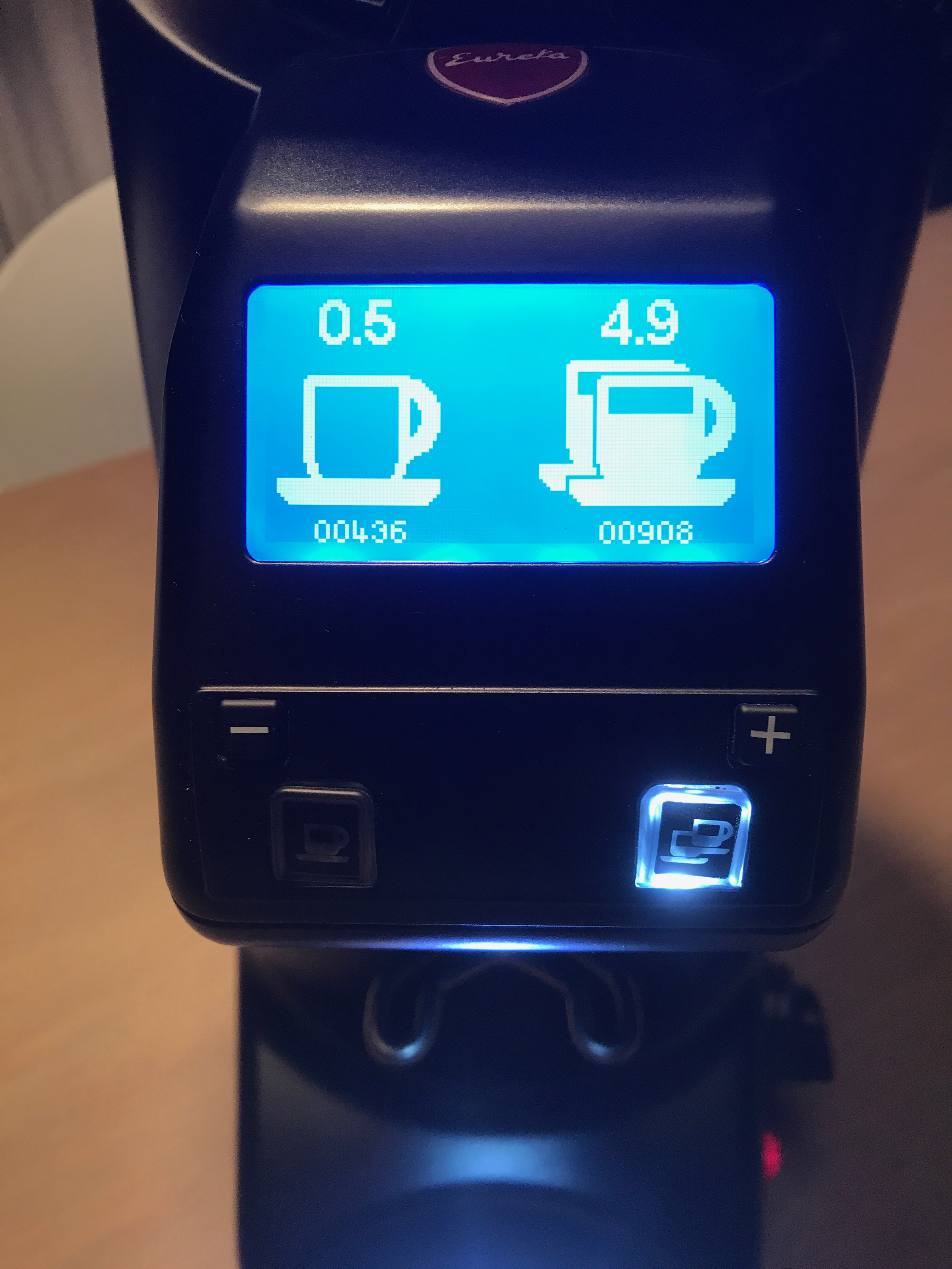 Maler is in absolute topstaat - maalschijven zijn mogelijk net ingemalen. Timer standen: 908 double shots (18 gram) & 436 single shot / adjustment ( 2 gram) - totaal minder dan 20KG gemalen.